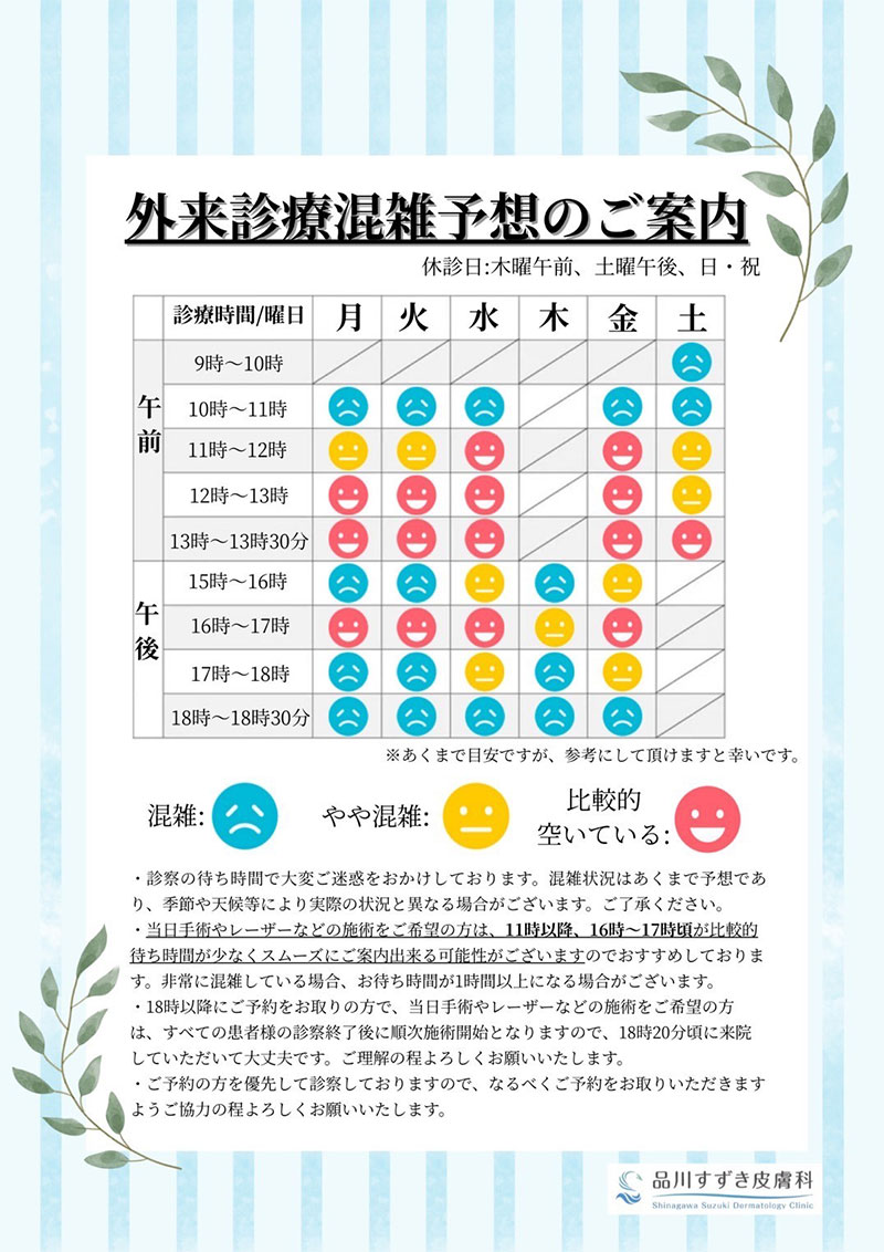 感染症に罹患している可能性がある患者様は必ず事前に申し出てください。感染症採血結果が出てからの手術も承っております(当院は陰性の方のみの手術対応になります)。 - 露出部とは、半袖や半ズボンで、外から見える部位、顔面、首、肘から先、膝から下を指しています。